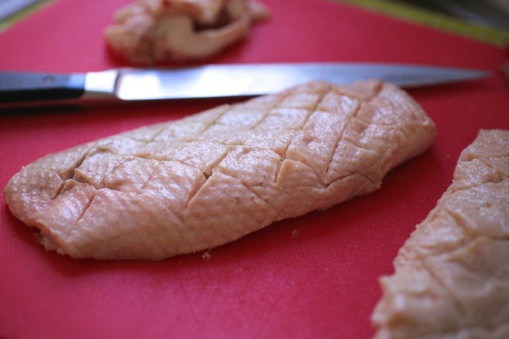 - Dry the duck breasts very well. Trim any silverskin from the meat side of the breasts. If there’s a lot of skin, trim the edges so there’s only about 1/4 inch overhang. With a very sharp knife, score the skin in a 1/2-inch crosshatch pattern being careful to cut only through the skin and not into the meat. Season the breasts well on both sides with salt and pepper.