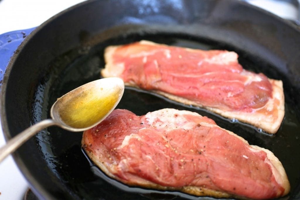 Make sure the breasts are very dry. Score the fat in a criss-cross pattern and place them, skin-side down in a cold pan. Turn the heat on very low and let the fat render very, very slowly. At this point, you’re not even cooking them, melting the fat below the skin. Depending on the size of the breasts, this can take 30, even 40 minutes but they payoff will be worth it. And other than spooning off the fat that collects in the pan every so often, you don’t have to so anything during this time.