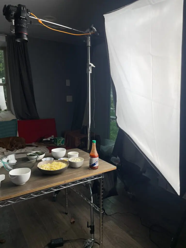 Unless you have an unlimited budget and a huge studio space to work with (we don’t, on either count), you’re going to have to make concessions to the equipment that you can purchase and fit into your working area. If you’re just starting out on the food photography path, know that you will also make some missteps. This is normal. We started with a small table light on our dining table. We’ve used folding tables. We’ve used tripods and C-stands, as well as using the camera hand-held. We’ve used batteries and power packs, wired connections and wireless, and a variety of lenses.