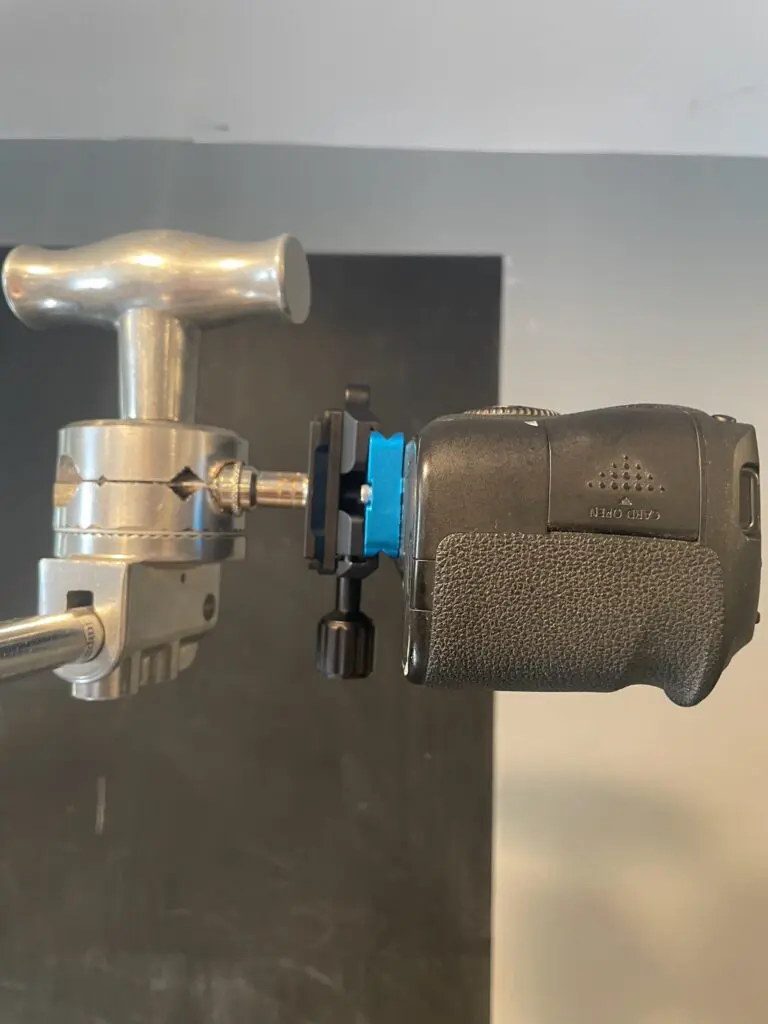 For overhead shots, we use this Impact C-stand and arm, and attach the camera base with a 1/4″ to 3/8″ screw adaptor.