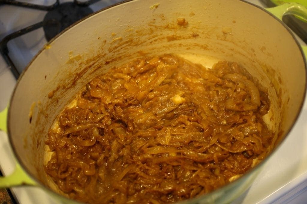 - In a large dutch oven or sauté pan, melt butter over medium-high heat until foaming. Add onions and 1/4 teaspoon kosher salt. Cover and cook, stirring occasionally, until softened, about 8 minutes. Remove the cover and lower heat to medium-low and cook, stirring frequently, until onions are very soft and a rich, golden brown color, 1 to 1 1/2 hours. During this time, if the bottom of the pot develops a crust that threatens to burn, add 1 tablespoon of water, scrape up the browned bits, and continue cooking. You may need to do this several times, especially towards the end of the process.