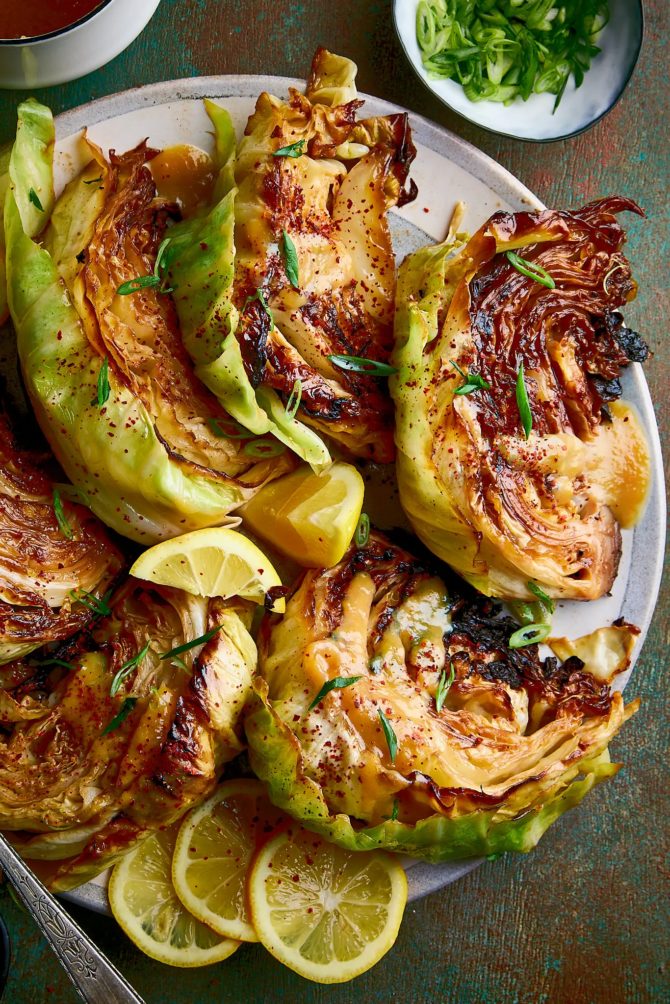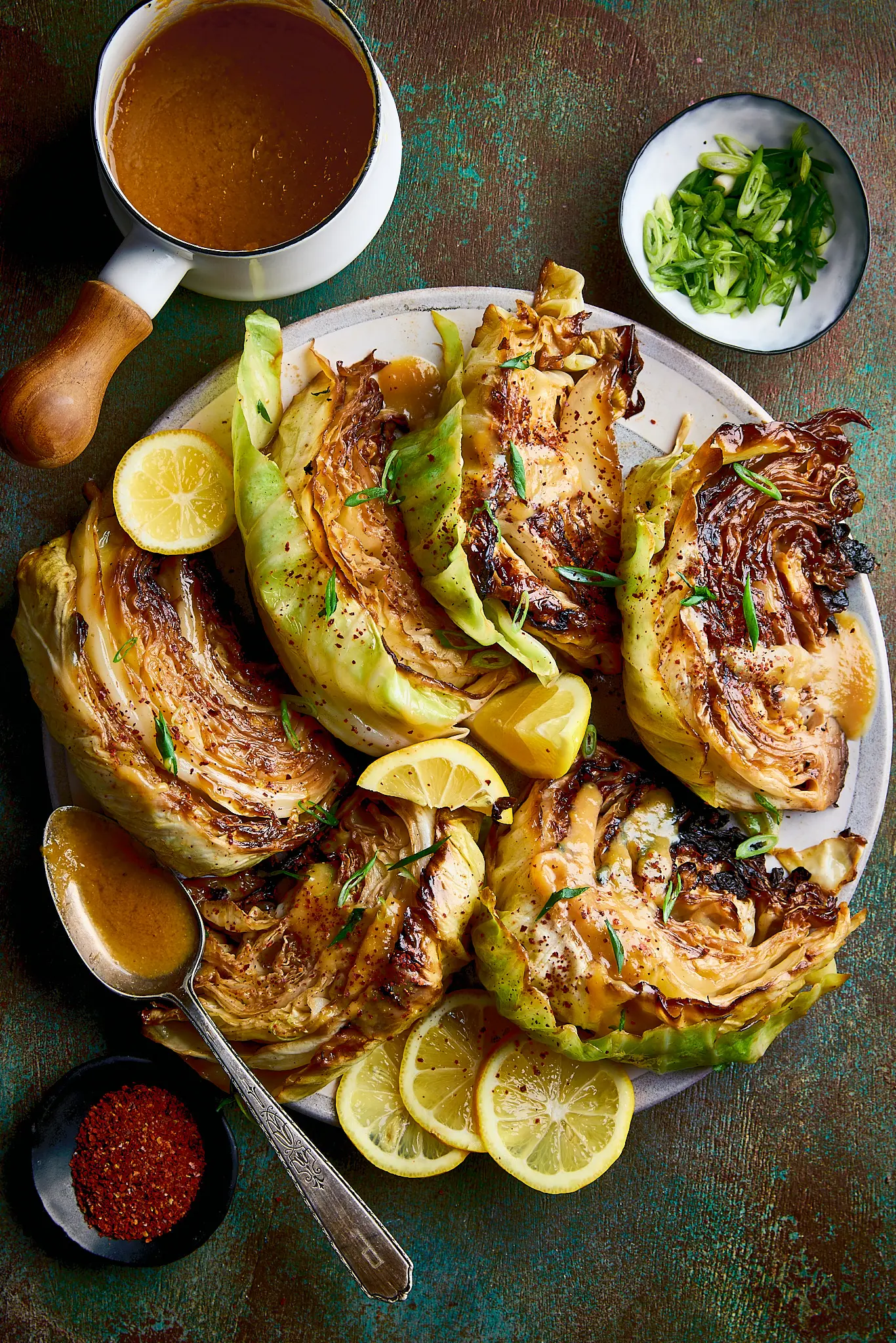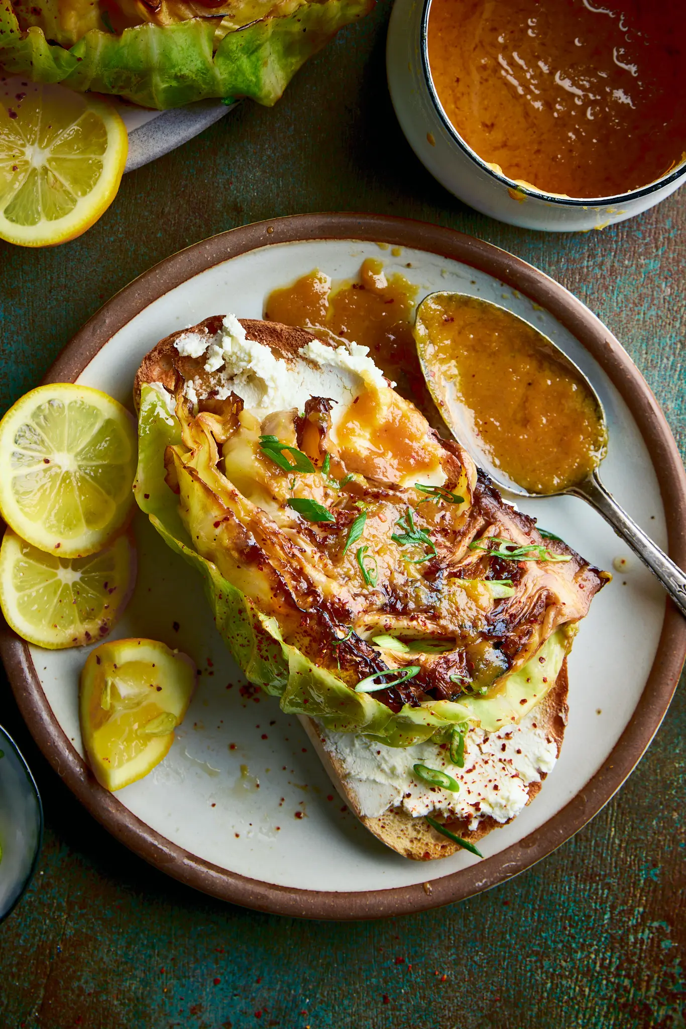 - Top each piece of toast with a wedge of cabbage, then spoon over about a tablespoon of the warm miso-butter sauce. Squeeze a little lemon juice over the wedges and finish with a sprinkle of scallions. Serve warm.