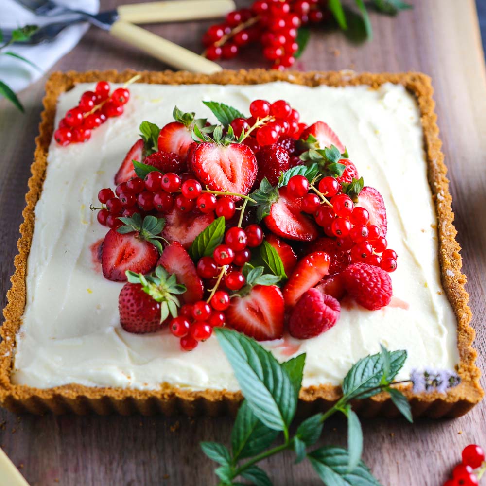 Vanilla custard tart made from homemade pastry cream and an easy graham cracker crust, topped with fresh summer berries. Perfect for summer parties!