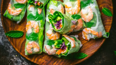 Fresh, light and delicious, Vietnamese summer rolls are a great appetizer or light meal any time of the year. Crisp vegetables, bright herbs and shrimp are rolled in a rice paper wrapper, with a side of sweet and salty peanut sauce for dipping.